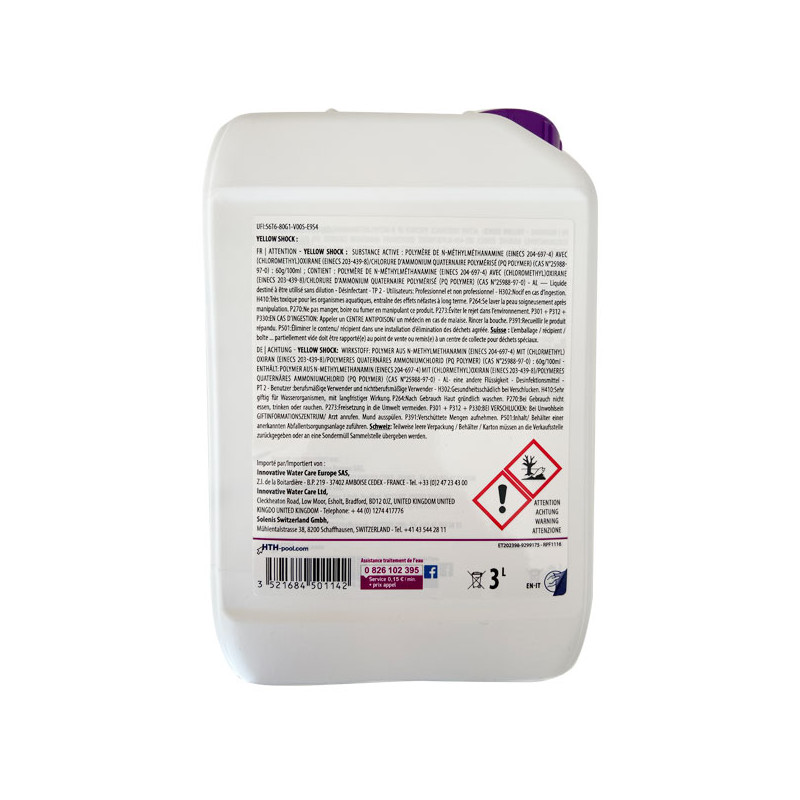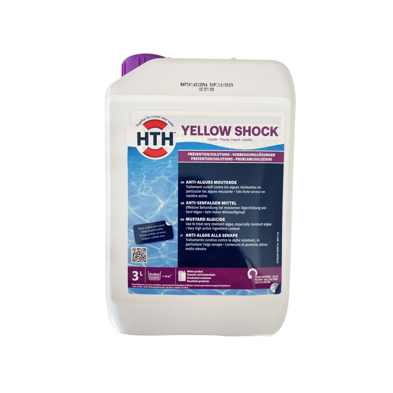 L'Anti-algues piscine hth YELLOW Shock liquide est un produit performant offrant une sécurité renforcée, sans reprotoxicité, pour une baignade plus sûre. Il est efficace contres les algues moutarde et autres algues résistantes.