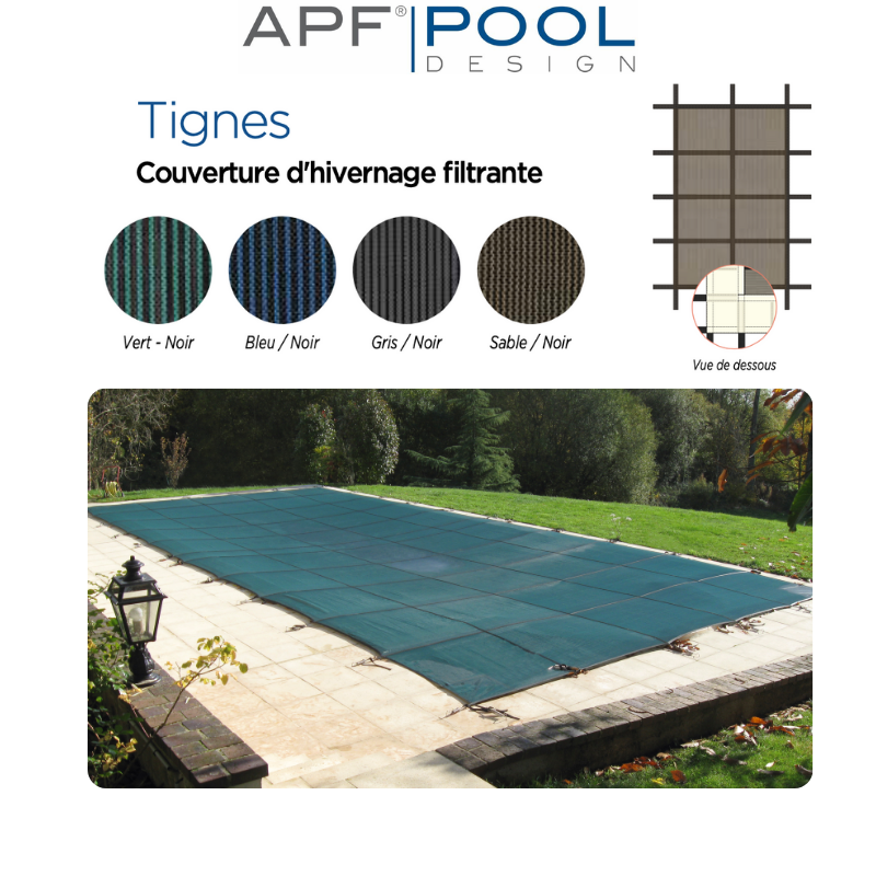 Les couvertures d’hivernage filtrantes sont conçues à partir d'un filet en polypropylène 150 g/m2 traité anti-UV et imputrescible, et assemblée par couture en fil polyester. Ne convient pas aux piscines à débordement.