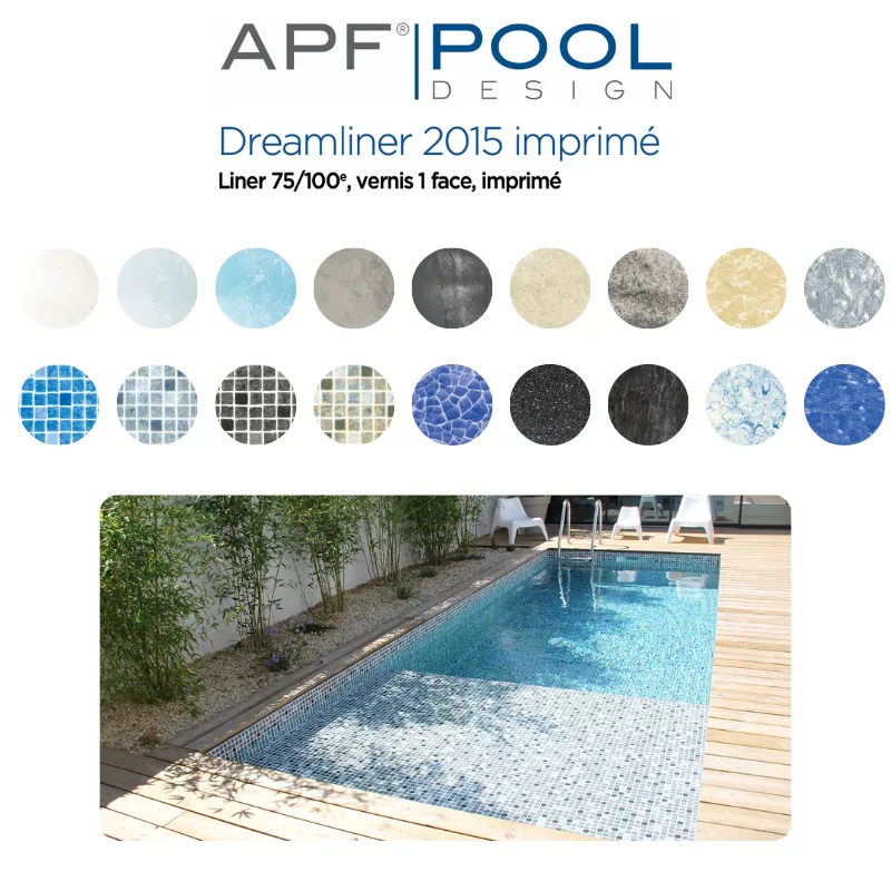 Le Liner imprimé APF DREAMLINER 2015 est composé d'un liner 75/100ème doté d’un vernis sur la face côté eau. Le vernis côté eau apporte une durabilité prolongé aux liners, préserve leur coloris ou leur motif et facilite le nettoyage de la ligne d’eau.