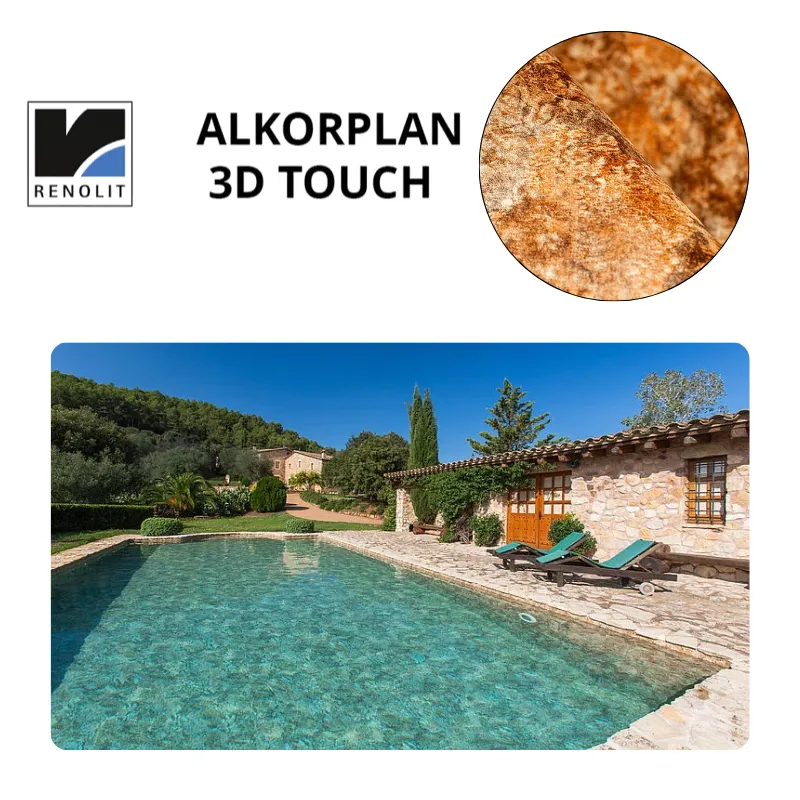 Le liner Alkorplan 3000 3D Touch est renforcé, verni et texturé. Ces 200/100 d’épaisseur confèrent à la membrane armée une résistance toute particulière, tout en donnant à votre piscine, une touche élégante, très personnelle, exclusive. Le TOUCH c’estl’illusion de la pierre naturelle, c’est la nature qui s’invite dans votre piscine.