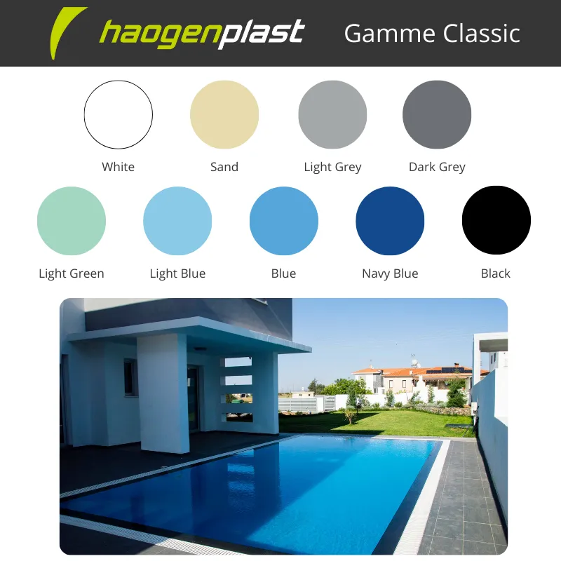 La Gamme Haogenplast Classic incarne une élégance intemporelle grâce à une palette de couleurs pures et unies, idéale pour les piscines mettant l’accent sur la clarté, la simplicité et la profondeur visuelle. Ces membranes en PVC présentent une esthétique minimaliste et épurée, pensée pour révéler la beauté naturelle de l’eau : son éclat, sa transparence et son mouvement. Cette gamme offre des solutions polyvalentes capables de s’harmoniser à tous les environnements. C'est une solution de revêtement fiable, durable et sécurisée, offrant une finition lisse, une surface antidérapante et une esthétique raffinée pour une expérience de piscine à la fois sereine et élégante.