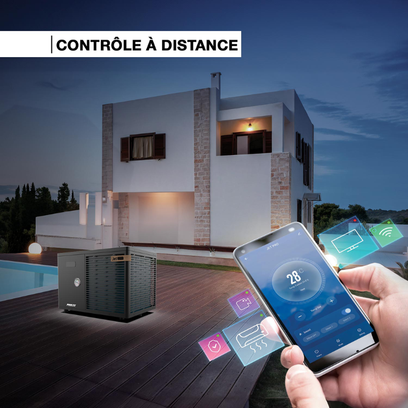 Avec ses finitions soignées, la Pompe à chaleur/PAC Poolex Jet City arbore un look élégant et moderne. Son design en aluminium thermolaqué lui confère une esthétique Premium et une durabilité accrue. Également connectée et intuitive, la Jet City intègre le Wi-Fi pour un contrôle facile à distance via l’application Poolex, permettant une gestion simplifiée de votre pompe à chaleur.