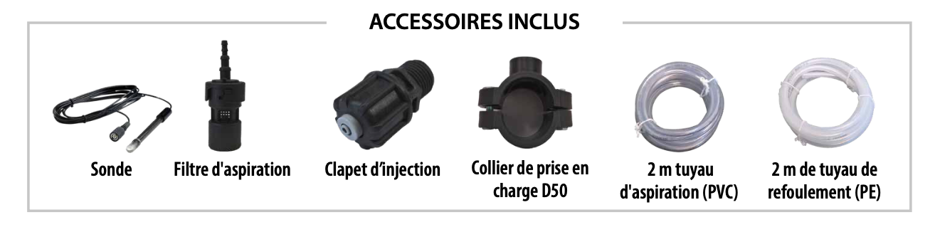 sondes, clapets d’injection, tubes d’aspiration et de refoulement, collier de prise en charge ainsi que la solution d’étalonnage.