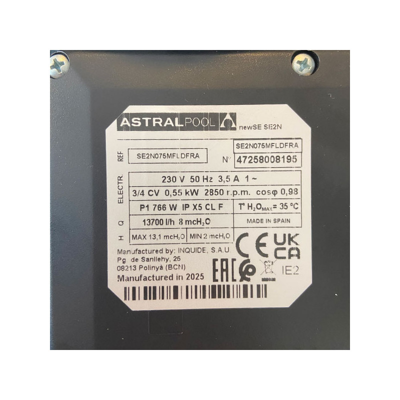 La Pompe Astral New Europa - Série SE2N remplace la pompe de filtration Astral Europa, gagnant ainsi en qualité. Elle s'installe en remplacement des modèles Europa et Super Star II. Les matériaux de qualité utilisés pour sa fabrication en font une pompe très appréciée pour sa résistance et son efficacité. Elle dispose d’un pré-filtre de grande capacité (4L) qui retient les principaux débris et garantit un maximum de passage d’eau. Un couvercle transparent en poly-carbonate permet de contrôler le niveau de propreté du filtre, équipé d’un système de fermeture avec manette de serrage pour plus de simplicité. Son moteur fermé offre un silence de fonctionnement particulièrement appréciable.