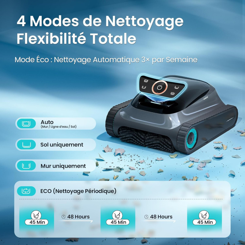 Doté de plusieurs modes de nettoyage (Auto, Sol, Mur et Éco), ce robot s’adapte à vos besoins et garantit un nettoyage complet du fond, des parois et de la ligne d’eau. Son moteur brushless et son système de filtration puissant lui permettent de filtrer jusqu’à 4200 GPH d’eau tout en capturant efficacement saletés, feuilles ou dépôt fins.