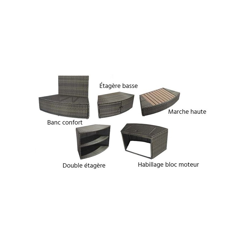 Ainsi, vous trouverez une étagère basse pour le rangement, une marche haute afin d'accéder et de sortir du spa, un banc confort pour faire une pause entre deux séances relaxantes, une double étagère pour ranger vos affaires personnelles et un habillage pour le bloc moteur afin de lui donner un côté plus esthétique tout en garantissant sa protection.