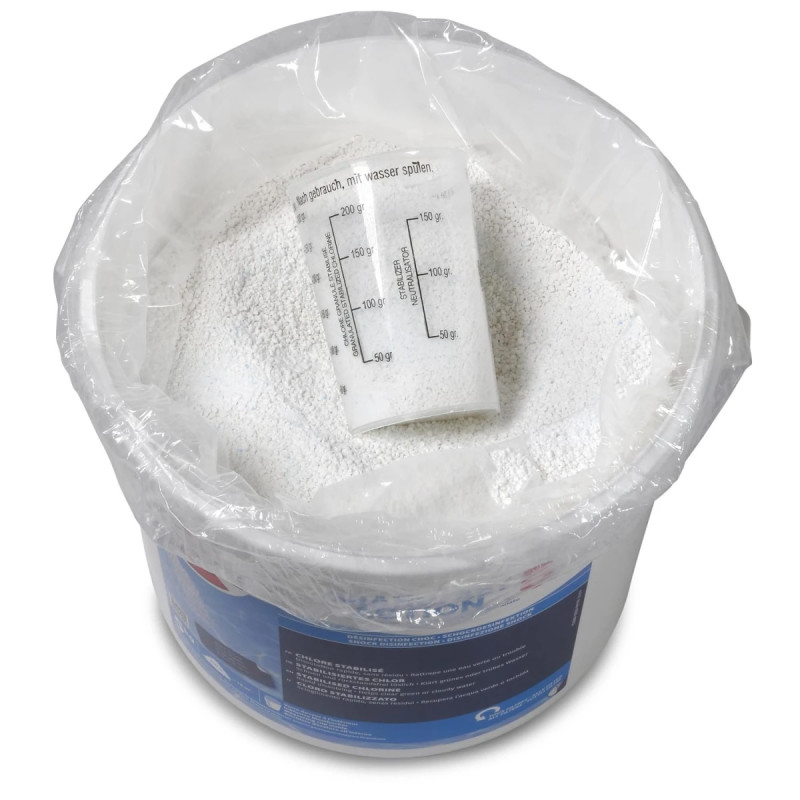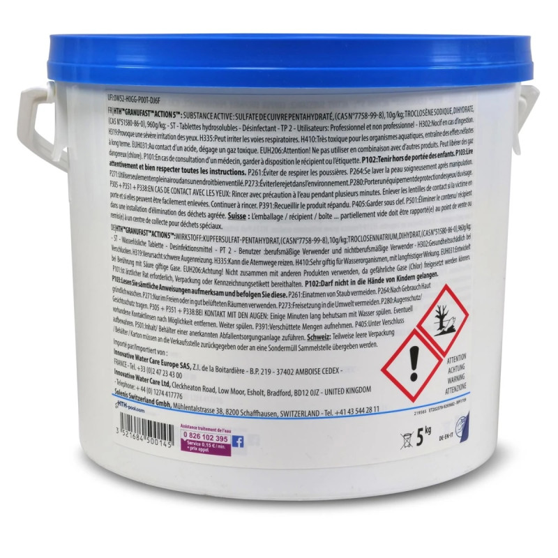 Le chlore hth® GRANUFAST Action 5 est le premier traitement multifonction de chlore stabilisé choc en granulés.